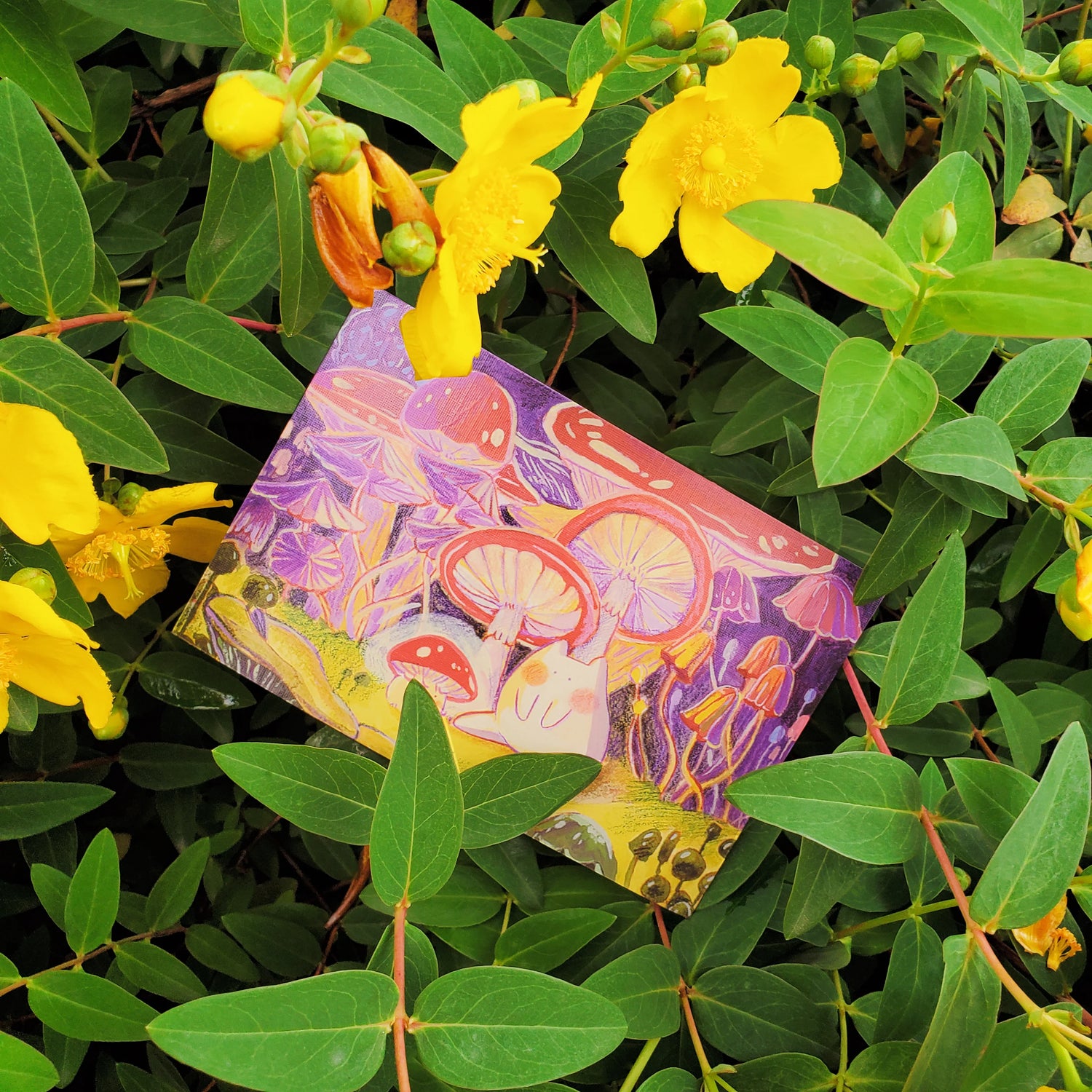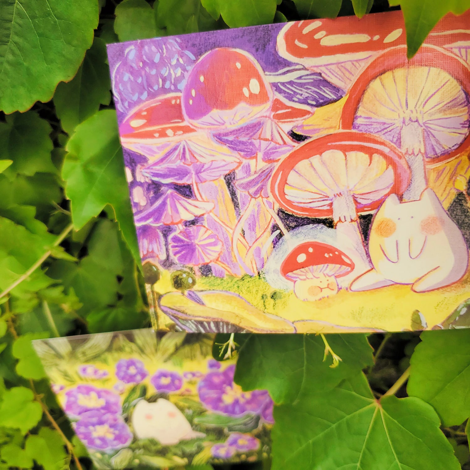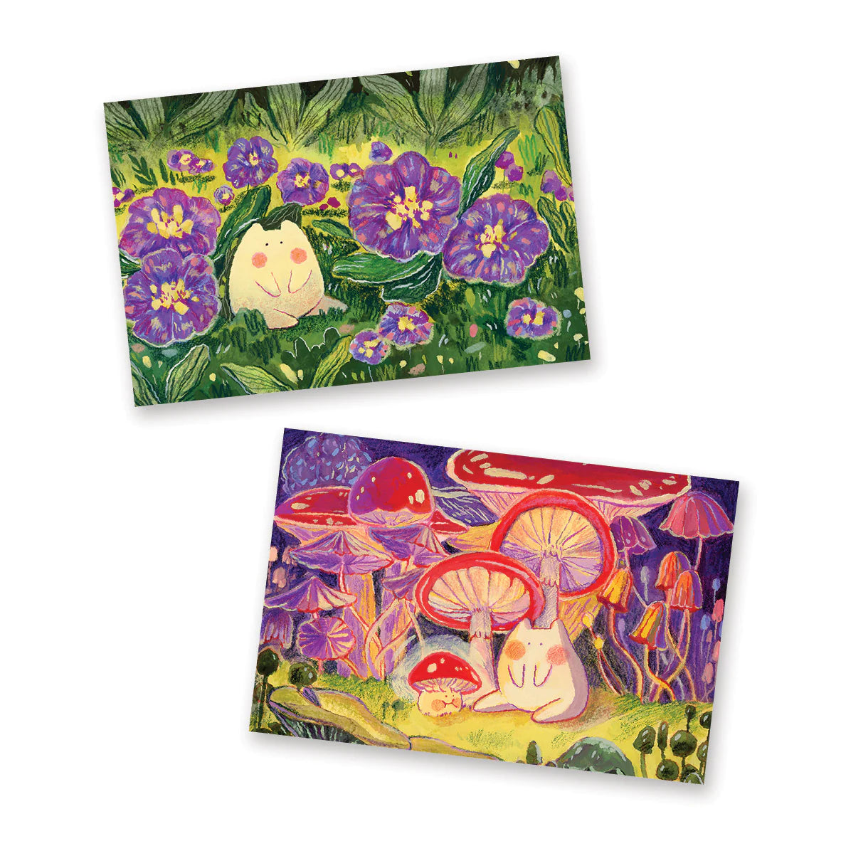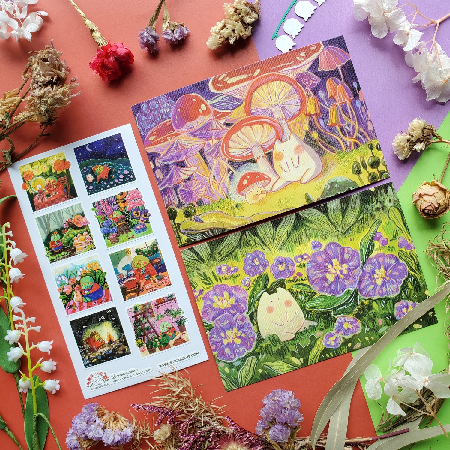 The set features smol boi in a colorful field of flowers and in a whimsical mushroom forest.